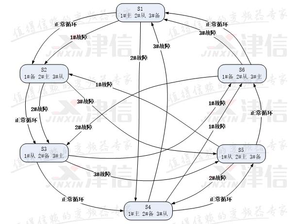 2、機組發生故障:在某一個機組發生故障,包括斷路器跳閘、變頻器故障、水泵電機故障、閥門故障,并且無法繼續運行的情況下,PLC將故障機組停掉并自動轉換工作模式,投入備用機組,同時將故障信息發送到監控中心。在故障機組被修好之前,只選擇兩個正常的機組進行主/從輪換控制。兩用一備供水系統機組全部工作模式如下: