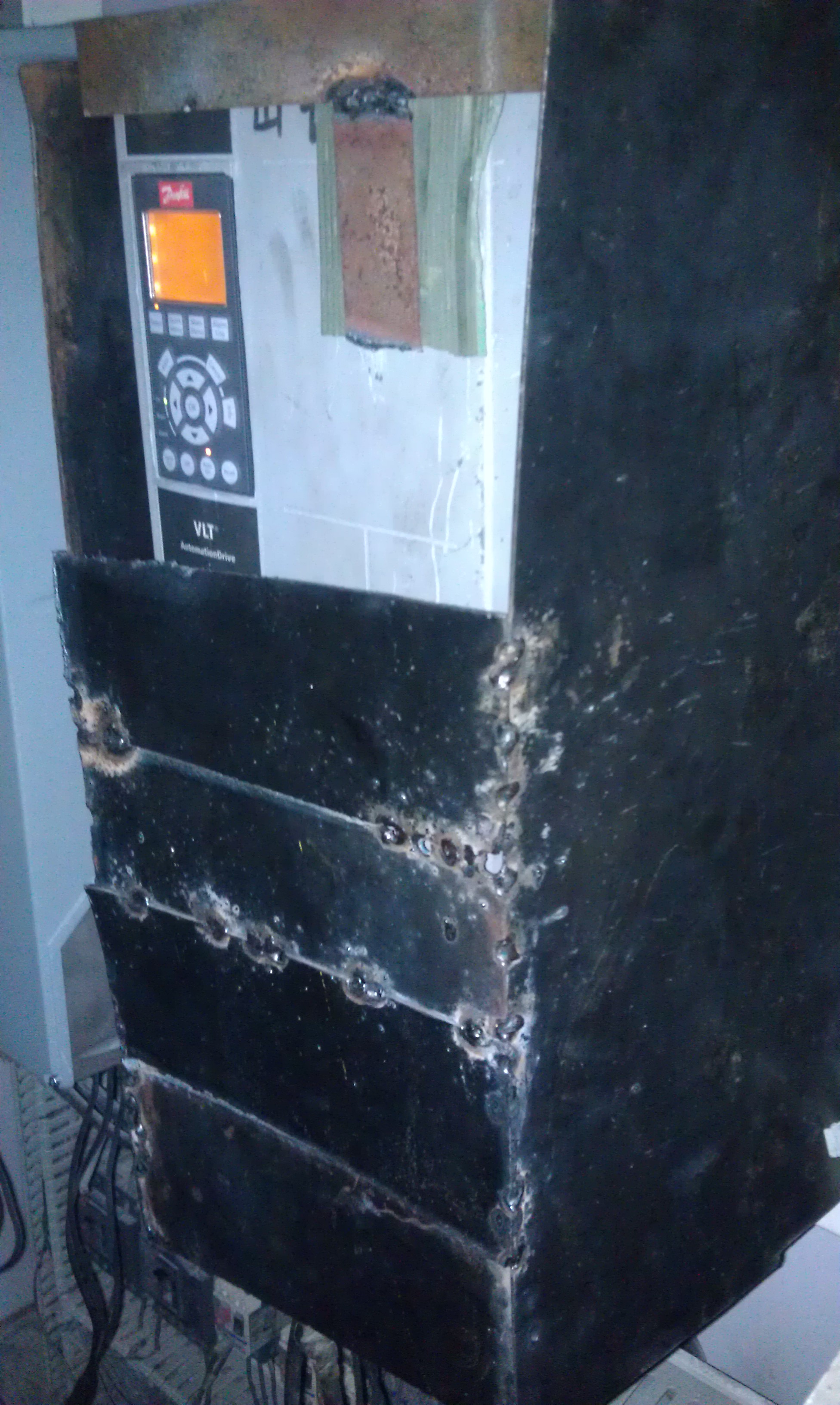 最后通過以上分析,現(xiàn)場服務(wù)工程師決定對新變頻器做一個(gè)磁場屏蔽的實(shí)驗(yàn),做一個(gè)鐵的環(huán)形屏蔽,如圖所示,設(shè)備重啟后馬上就運(yùn)行正常了,并且連續(xù)運(yùn)行了16個(gè)小時(shí),期間無任何故障報(bào)警,一切運(yùn)轉(zhuǎn)正常。