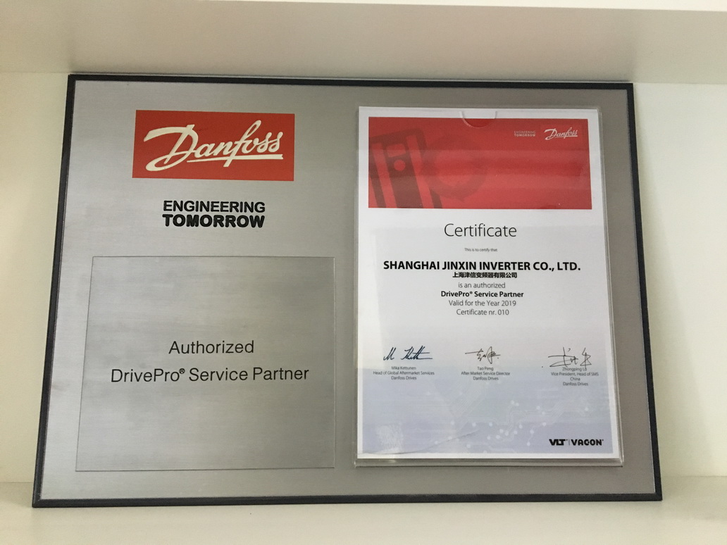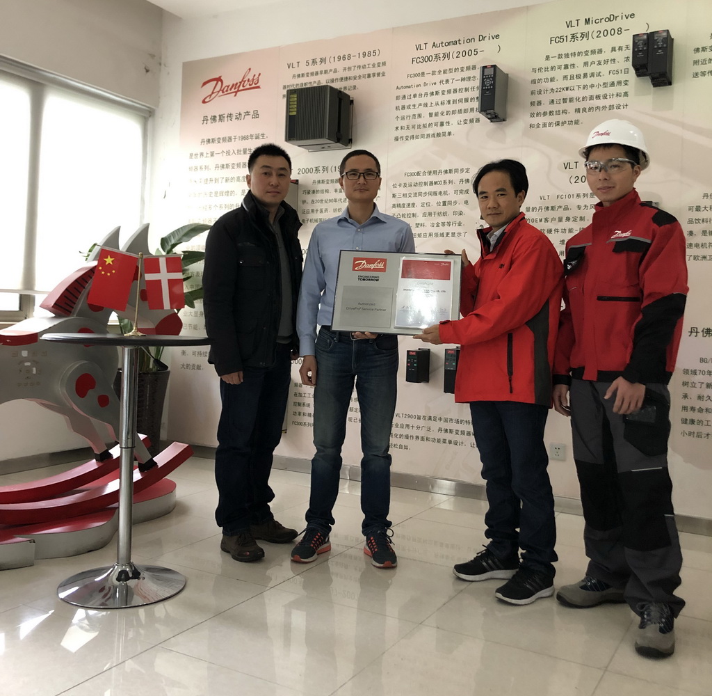 2018年12月11日, 丹佛斯中國區服務總監彭濤先生和服務經理毛申麟先生向上海津信變頻器有限公司頒發了丹佛斯授權“DrivePro®”服務商的授權證書。上海津信成為全球第十家,中國華東和華南地區丹佛斯授權“DrivePro®”服務商。
